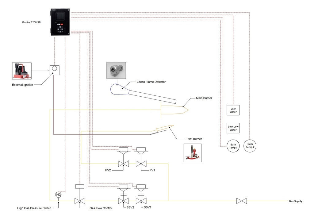 1The PROFIRE PF2200-SB controller has been specifically designed to enhance the performance and control of a wide array of natural draft fire tube applications. The PF2200-SB delivers the most powerful yet simple user experience possible. Perfect for most Atmospheric Water Bath heaters/burners. Suitable for verification to NZ gas standards. Looks after heater temp control, Interlocks, Fault output, Burner/pilot/Control valves and flame supervision functions.